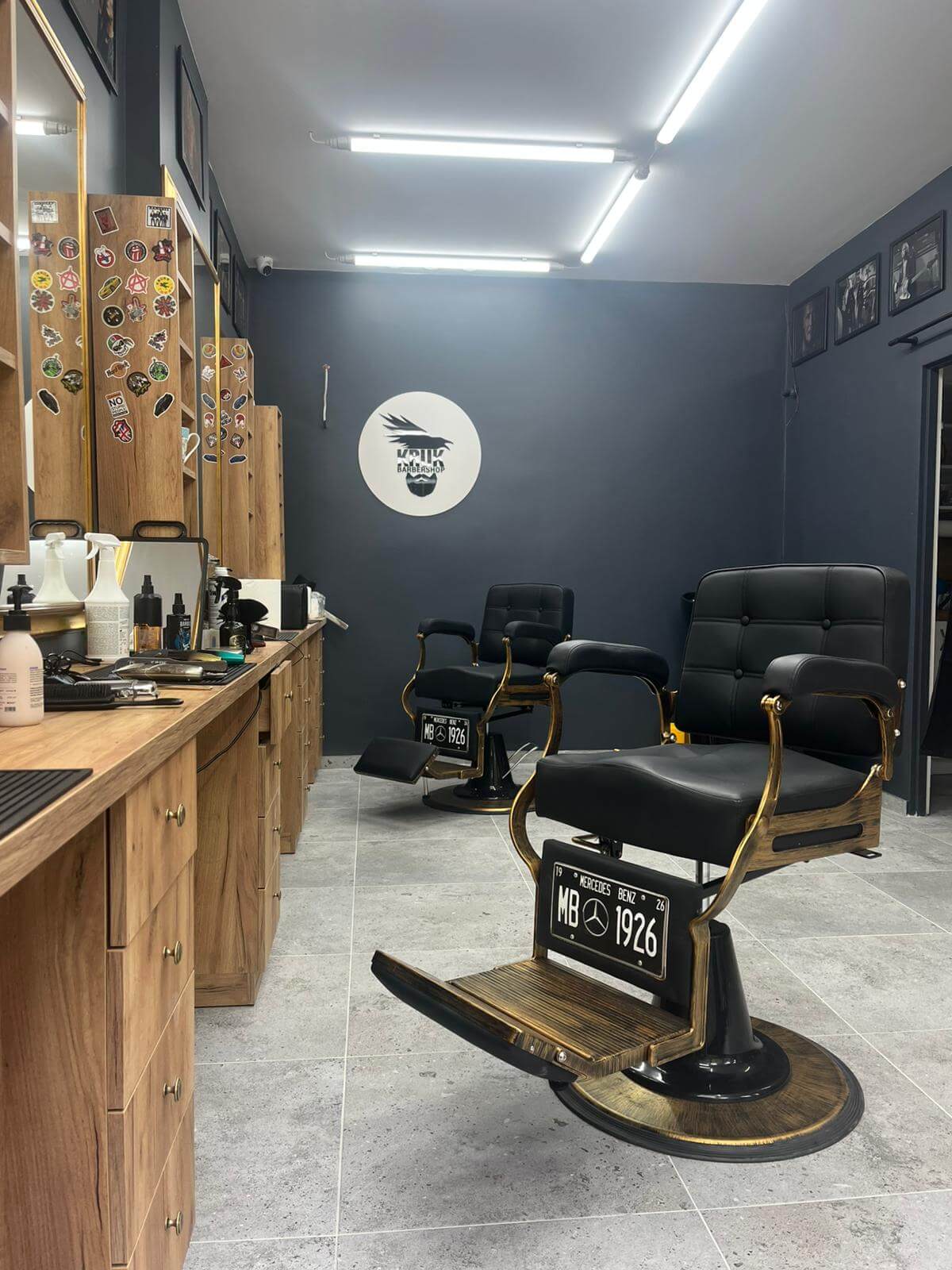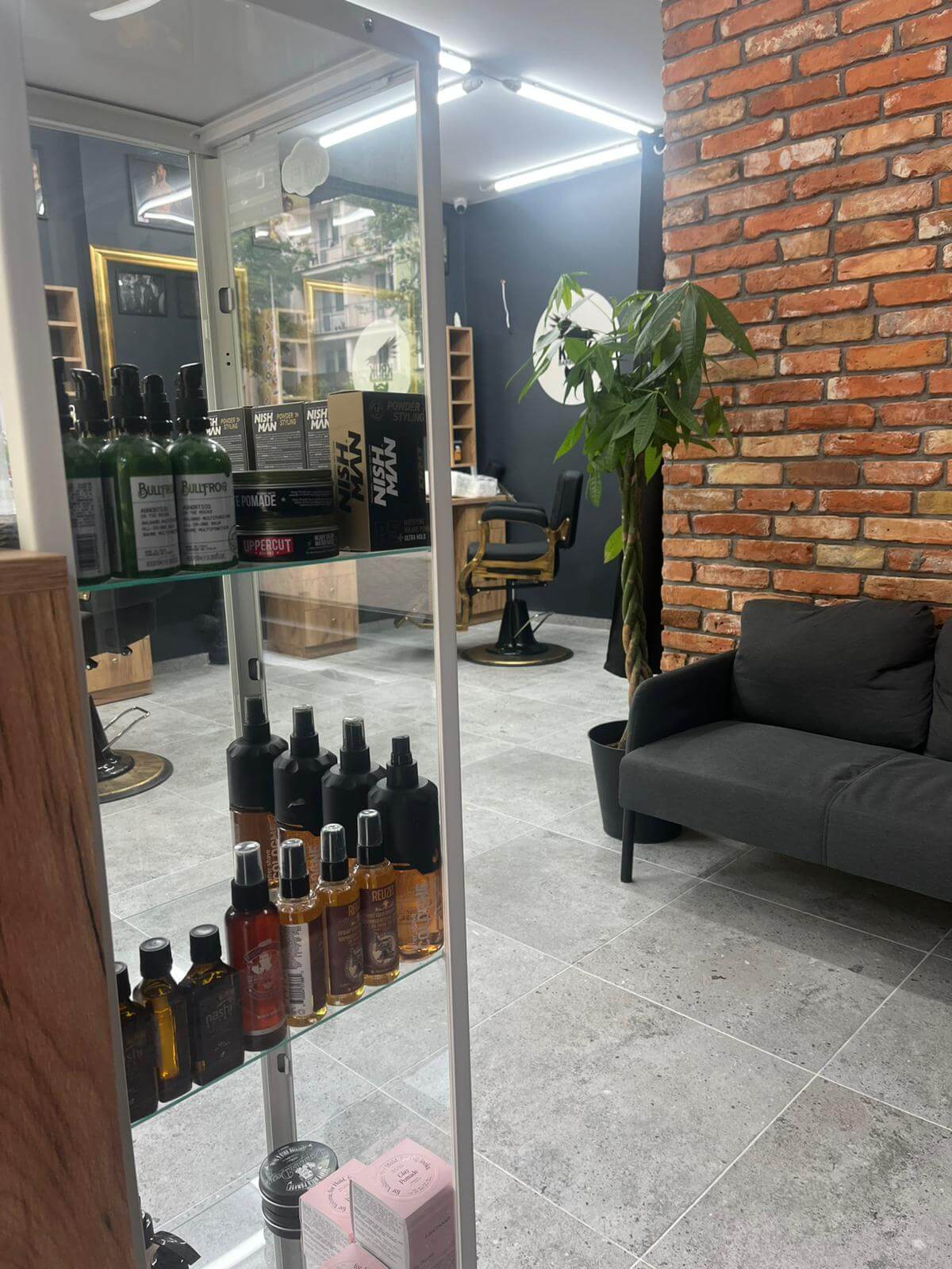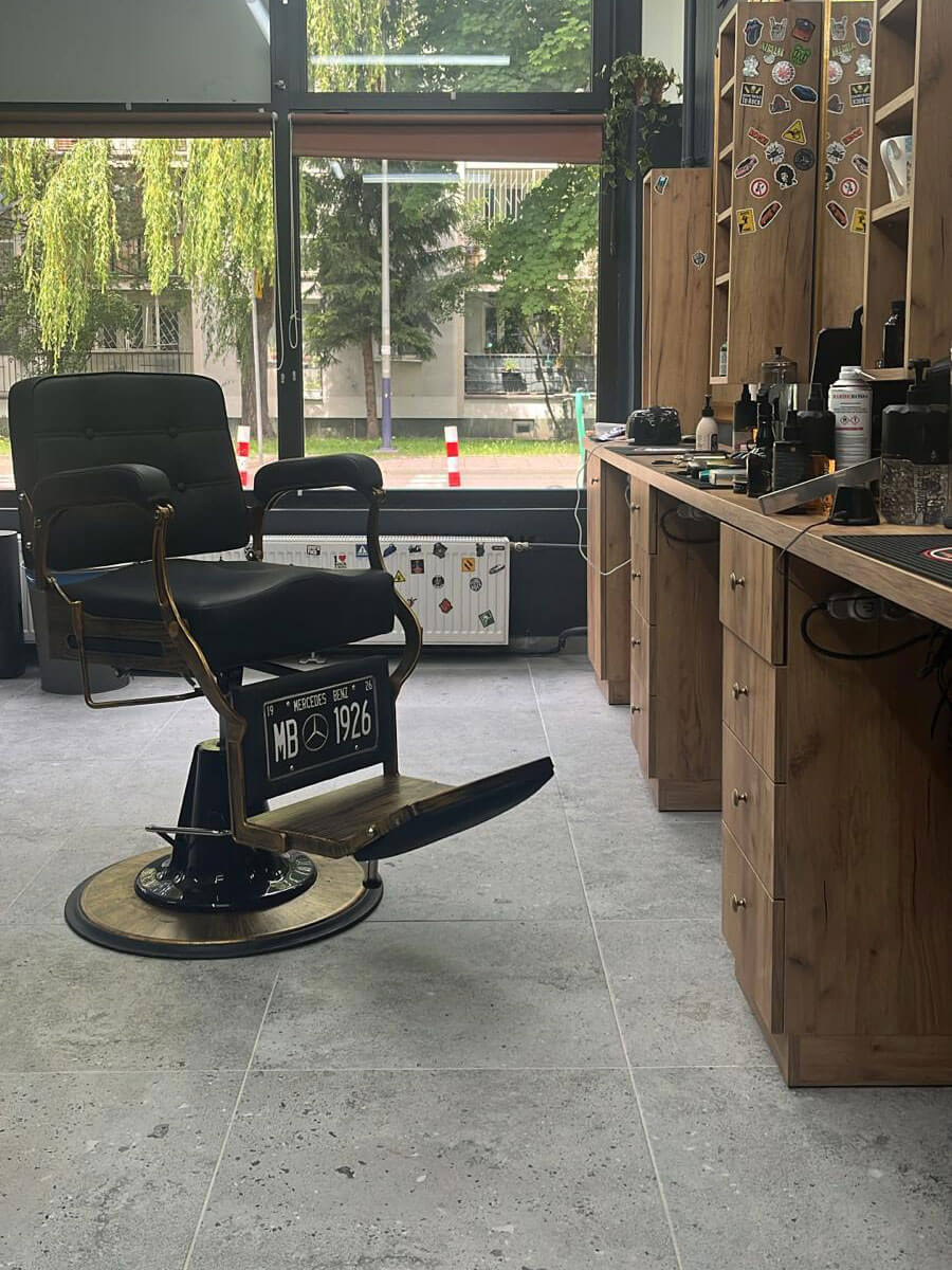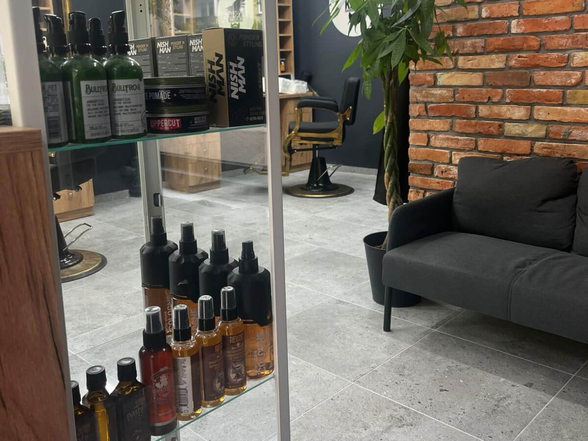 Wnętrze salonu to nie showroom, tylko przestrzeń dla Ciebie. Wygodne fotele, pełnowymiarowa myjka, przestronna poczekalnia – wszystko po to, żebyś czuł się komfortowo. Ściany pokrywają cegły, detale w drewnie i antracytowe wykończenia budują ciepły, męski klimat.
